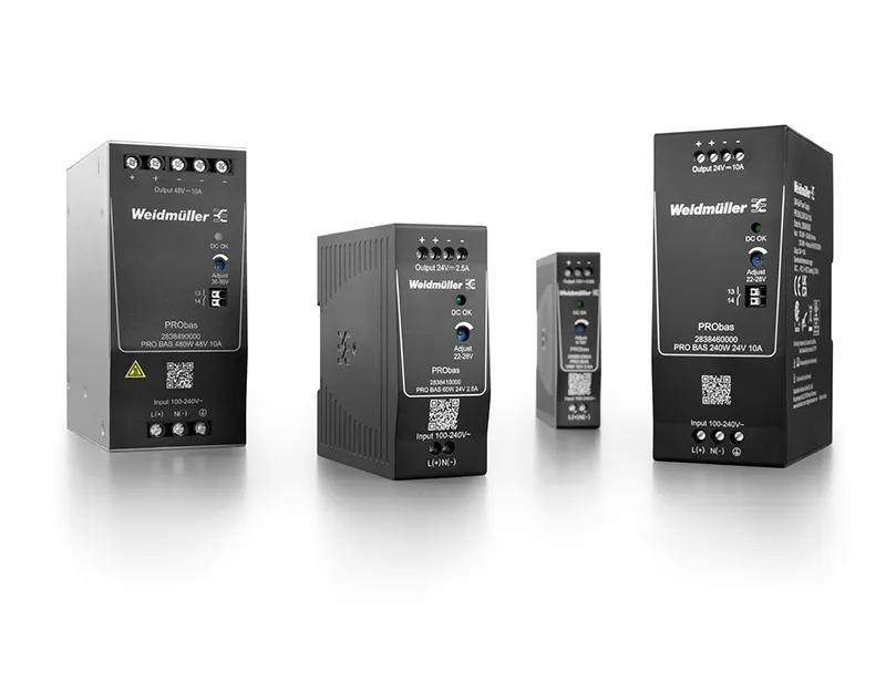High performance, compact design and a good price-performance ratio are the main characteristics of the new PRObas power supplies. The product family comprises 12 variants with 5, 12, 24 or 48 VDC output voltage and a wide-range input. All units have comprehensive safety functions and are internationally approved. Due to compatibility with Weidmüller electronic fuses, DC UPS and diode modules, they are also suitable for setting up power management systems.